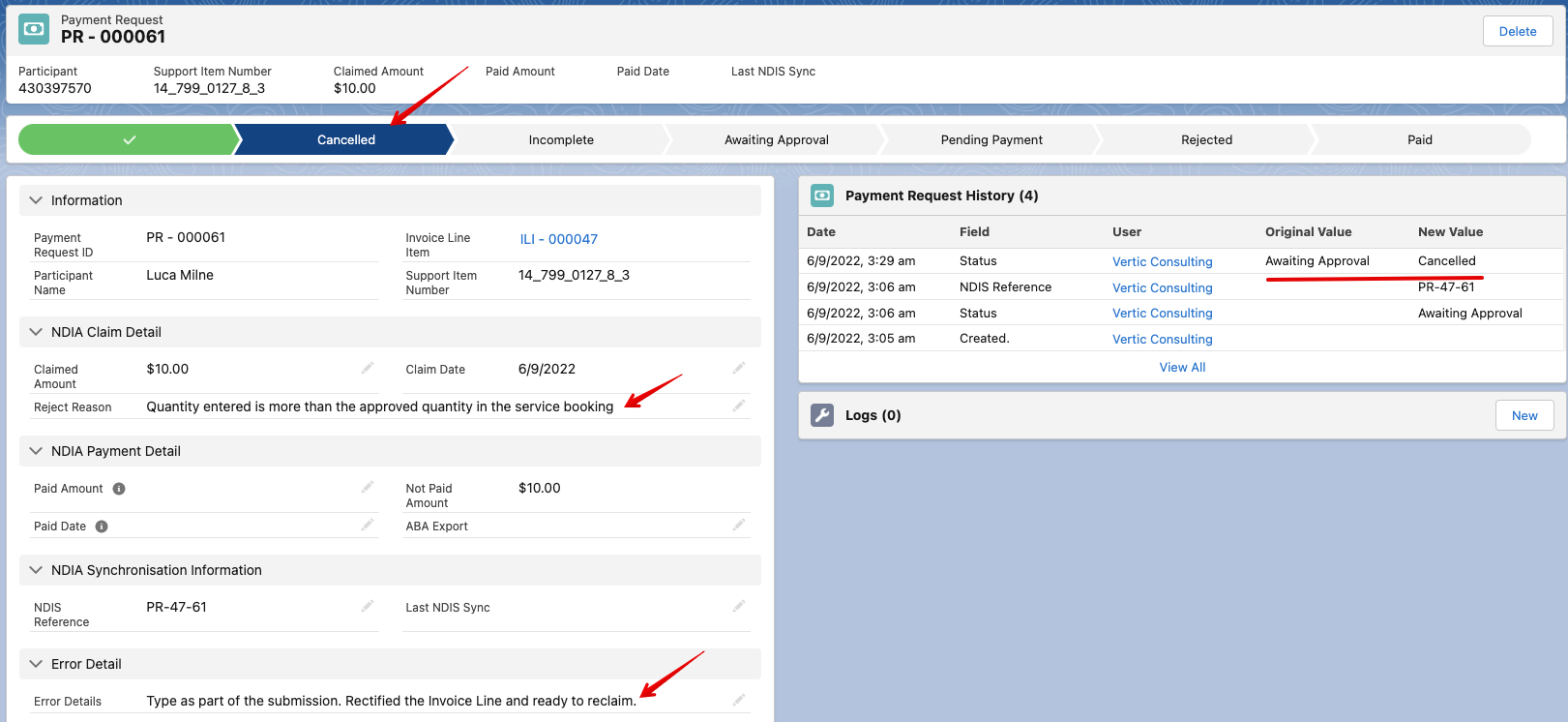 Once you click **Save**, the `Payment Request` `Status` will be set to `Cancelled` and the `Reject Reason` and `Error Details` will be saved also.