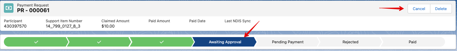 In this scenario, once you have made the necessary updates in PRODA, you then need to **Cancel** the existing `Payment Request` in Salesforce to support reclaiming.  You can do this by simply by clicking the Cancel Quick Action in the Payment request record header.