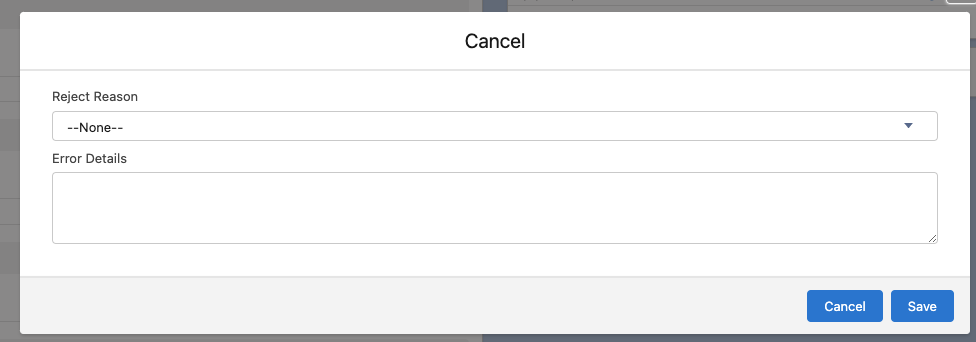 Once you click **Cancel**, you will be presented with the modal below.  Select the appropriate `Reject Reason` and be sure to add any `Error Details` in the textbox to keep a record in Salesforce of the Error and what was done to rectify it.